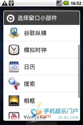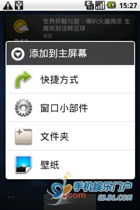 在屏幕空白的位置長按(也可以按MENU鍵選擇添加),機器會震動一下然後彈出對話框添加,選擇窗口小部件,然後選擇想要添加的部件,就能夠把該部件添加到屏幕,當然必須保證屏幕有足夠的空間哦。