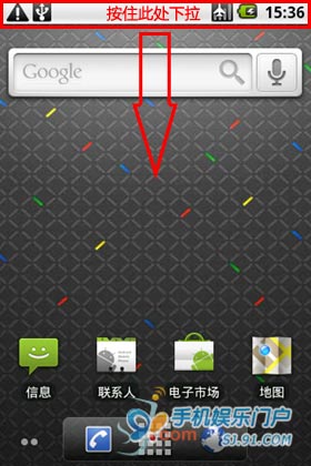 2、等一會兒手機屏幕左上角會出現兩個小圖標,按住屏幕最上面的條欄不放往下拉動;