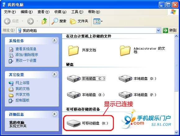 完成以上步驟以後,手機即已經切換到USB數據傳輸模式,點擊計算機的我的電腦,可以看到可移動磁盤,此時就可以進行資料傳輸了。