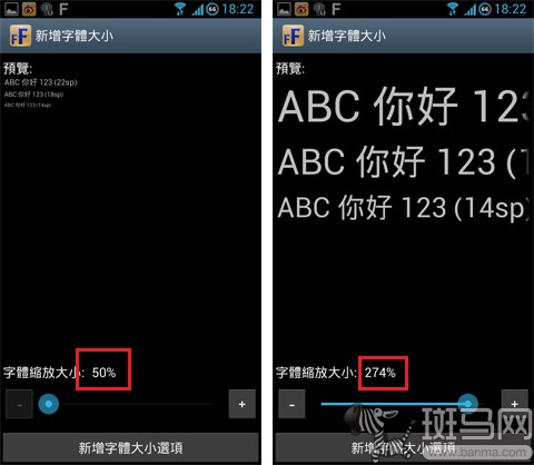 仔細的朋友大概已經發現了,應用中默認只提供了85%、90%、正常、115%、135%一共五個選項。就算是最大的135%,跟自帶的最大號字體也沒多少差距啊。別急,點擊右上角的“F+”按鈕,然後拖動下方的滑塊即可自定義字體大小了。從最小的50%到最大的300%,統統木問題!最後不要忘記點擊底部的“新增字體大小選項”就可以。