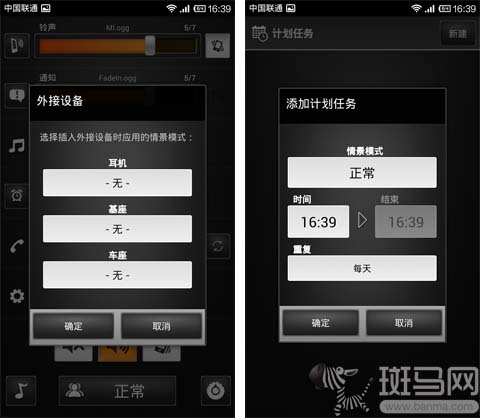 到這就完了嗎?當然不!有了情景模式,怎麼可以沒有智能切換呢?在主界面點擊菜單鍵,可以看到“計劃任務”以及“外接設備”的選項。在這裡我們可以決定某個時間段自動切換到特定的情景模式,或者插上耳機自動切換為適合聽歌的音量。睡覺或者上課時間段自動靜音這種事完成起來毫無壓力有木有?