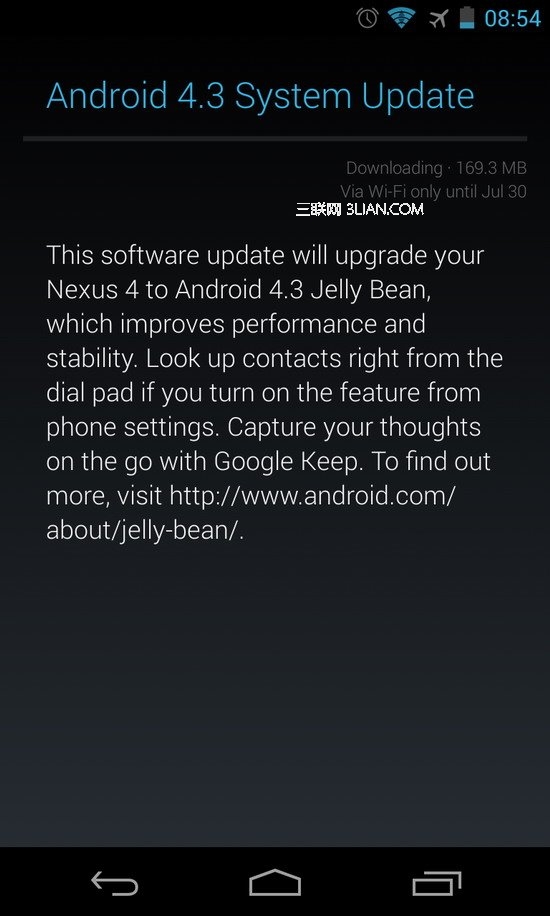 3、新應用:KeepGoogle在Android 4.3新增了一個叫Keep的應用,是一個便簽記事的程序,同時可以和Google賬戶同步,是Google Drive裡的一項服務。之前Android是一直沒有官方便簽應用的,但iOS有。Keep記錄的內容可以是文本、清單、照片、錄音,內容挺豐富,有點簡化版Evernote的意思了。同時,Android社區裡有用戶反映Android 4.3的耗電和發熱有所改善。Android 4.3也有一些升級了之後反到不便的地方,比如有一些應用長時間駐留在下來通知欄,不能清除,有“強迫症”的用戶苦惱了。現在來看,Android 4.3主要還是一個過渡性的升級,從內在增加對藍牙、OpenGL ES 3.0支持,作用在以後更高性能、更多功能的新硬件中會有更好體現;對已上市機型,只是一些功能的完善。附:Nexus 4強制OTA升級方法: