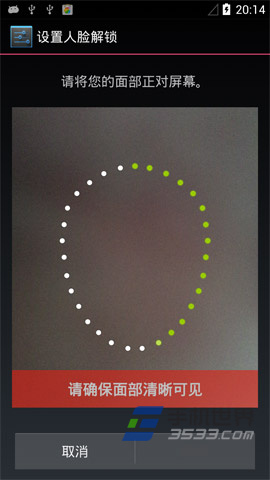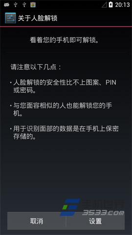 3)點擊“人臉解鎖”功能會,先會跳轉到“人臉解鎖”功能說明界面,然後點擊設置,請把攝像頭對准自己臉部進行人臉捕獲。(如下圖所示)