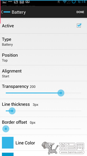 選好通知類型以後就可以進行更詳細的設置了,可以設置通知線顯示的位置、寬度、透明度、顏色等等,可定義內容非常豐富。而且可以進行顏色通知的設置,以電量為例,我們可以將它設置為低於某個數值以後切換顏色,更方便我們掌握手機的狀態。