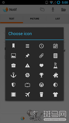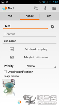 由於《Notif》利用的是安卓4.1版本的通知欄特性,所以只有安卓4.1以上版本的用戶才能使用。進入《Notif》以後可以看到主界面簡單明快,用戶可以添加文字、圖片、列表三種不同的通知。
