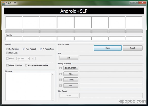 7) 確認Odin已經勾選“自動重啟”(Auto Reboot)和“F Reset Time”選項,如果你在選擇文件時有.pit文件,還要勾選“重新分區”(Re-Partition)。