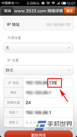 4)小編在這就把IP地址的後三位從112改為139給大家演示一下吧!大家可以看到,帶修改後點擊“確認”按鈕後,IP地址就變為了尾數139的IP地址,如下次再次連接該熱點,IP地址也不再是自動獲取,而是固定的靜態IP139。