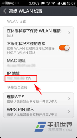 2)大家按照平常一樣連接一個無線網絡,或者連接自己需要設置靜態IP地址的無線熱點。待連接好後點擊該熱點進入高級設置,在IP設置一欄裡進行選擇。(如下圖所示)