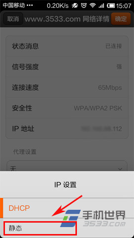 3)在IP設置欄裡點擊後選擇“靜態”,在進入“靜態IP”設置欄後,大家就可以對IP地址進行修改設置為固定的了。