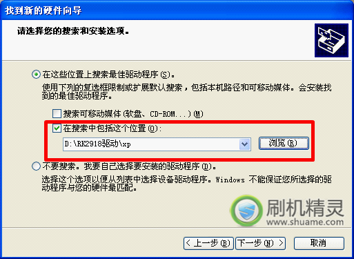 選擇驅動文件存放目錄,筆者這裡是D:RK2918驅動xp目錄,如您的電腦是VISTA或WIN7,就需要選擇