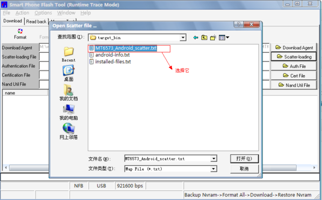 選擇Scatter file文件,存放路徑target_bin----MTK6573_Android_scatter