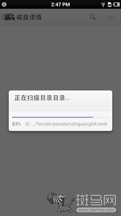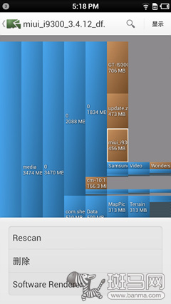 啟動《DiskUsage》後,它會掃描手機容量和SD儲存卡的信息,然後以圖例的形式顯示出來,可以一幕了然的看出來究竟是什麼文件占據了儲存空間。其中藍色為文件夾,綠色為不推薦刪除的系統文件和剩余空間,棕色就是可刪除的文件了。我們可以通過點擊來逐級放大來查看文件的細節。