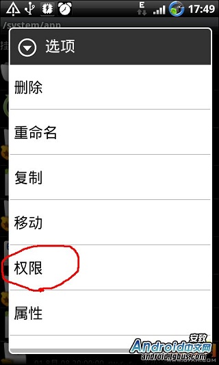 要刪除那個文件,就在該文件上長按,會出現“選項”,選擇“權限”: