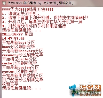 好了,這篇華為C8650刷機失敗改正教程講完了,你是不是不在擔心自己會刷機失敗了呢,刷機發燒友以後再也不用擔心咯!