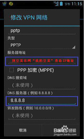 4)在服務器地址欄上面添加海外服務器IP,在豆莢官網“我的豆莢”裡面查看,有免費的IP和收費的IP,根據各自的不同情況選擇,另外,將DNS修改為8.8.8.8