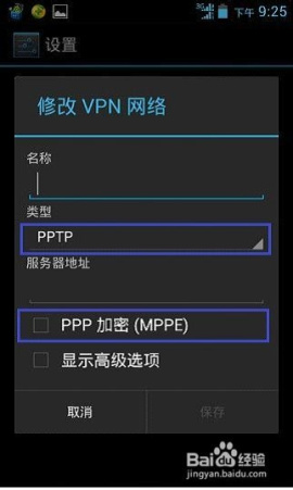 3)名稱隨便寫,類別可以選擇pptp、l2tp,這裡以pptp為例,選擇PPP加密
