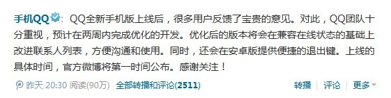 手機QQ團隊在其官方微博表示:“QQ全新手機版上線後,很多用戶反饋了寶貴的意見。對此,QQ團隊十分重視,預計在兩周內完成優化的開發。優化後的版本將會在兼容在線狀態的基礎上改進聯系人列表,方便溝通和使用。同時,還會在安卓版提供便捷的退出鍵。上線的具體時間,官方微博將第一時間公布。感謝關注!”