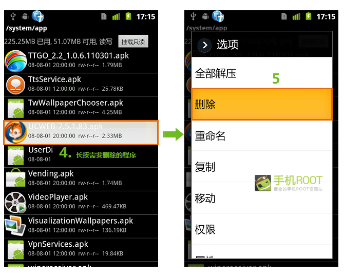 在手機端運行 R.E.管理器 根據下圖步驟操作,刪除您想刪除的軟件!