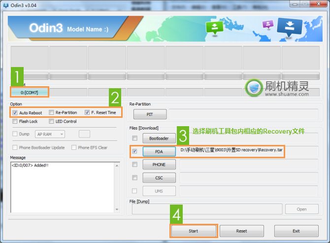 • 勾選如下圖其中兩個選項,點擊 Phone 按鈕選擇 工具包 內的 Recovery.tar 開始刷入Recovery