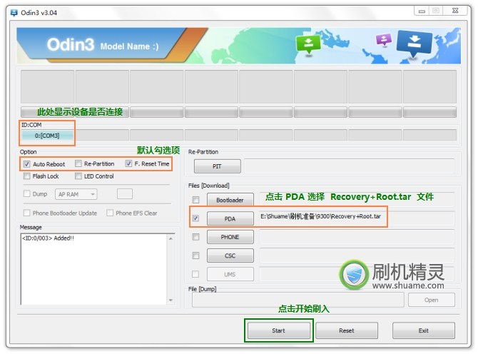 • 默認勾選項,點擊 PDA 按鈕,選擇下載所得的 Recovery+Root.tar 文件,