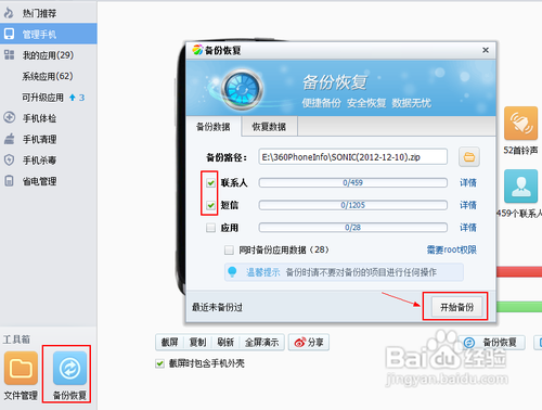 將手機中重要的資料進行備份,這一步需要根據自己的實際情況來確定,對於小編本人來說,手機當中最重要的資料當然是電話簿啦,為此,可以通過360手機助手將電話簿暫時備份到電腦上,等刷完ROM後再恢復到手機中。將手機通過數據線連接到電腦USB接口上,打開360安全衛士,點擊“手機助手”啟動連接操作。手機成功連接到電腦後,點擊360安全衛士左下角的備份數據按鈕,選擇聯系人和短信之後,點擊“開始備份”進行信息的備份操作。