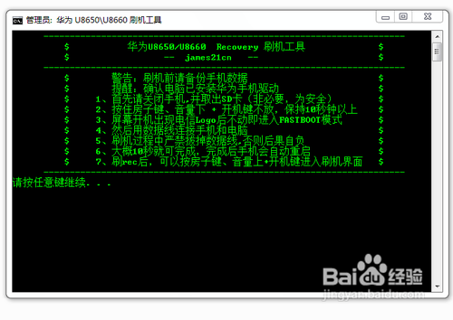 將ROM包下載到手機SD卡的根目錄下。然後關閉手機,同時按住“音量下”+“開機鍵”不放,保持10秒鐘以上時,屏幕開機出現LOGO後不動即進入FASTBOOT模式,然後將手機通過數據線連接到電腦USB接口上,雙擊運行Recovery目錄中的“雙擊刷入Recovery.bat”文件,在出現的界面中按任意鍵開始將Recovery程序寫入手機中。最後手機自動關機。