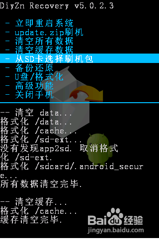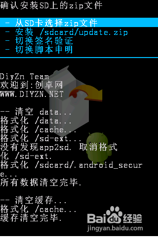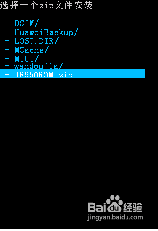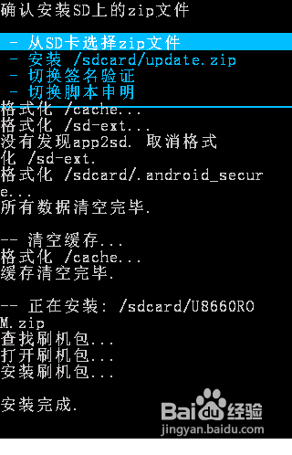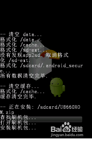 開始執行刷新ROM操作。首先利用音量“上”和“下”鍵選擇“從SD卡選擇數據包”,按“搜索”鍵進入,選擇”從SD卡安裝zip文件“,按“搜索”鍵進入,找到SD卡中的ROM程序(本經驗中ROM程序名稱為“U8660.zip"),然後在彈出的確認界面中按“搜索”鍵確認,之後就開始進行執行刷機操作。