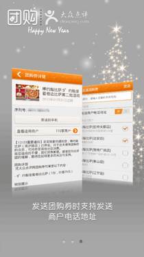 除以上功能外,點評團購1.2還支持發送團購券同時發送商戶電話地址和查看未使用抵用券兩項功能,同時將團購券和訂單功能合並在一起。