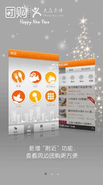 下載更新點評團購1.2之後,在初次使用時會有新功能的信息提示,讓用戶對新功能有一個初步的了解。點評團購1.2的界面風格基本沒有改變,下方的導航菜單的變化最為明顯,加入了附近功能,並將團購券和訂單功能整合在了一起,保持了點評團購界面簡潔美觀的特點。