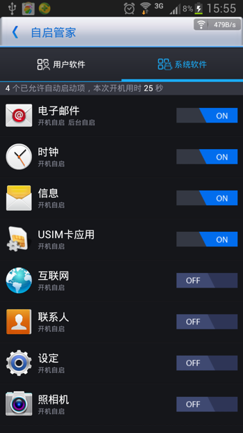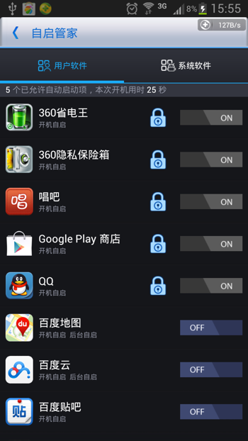 除了這個,另外再跟大家說一下,root之後可以禁止程序的後台自啟,包括自帶軟件的禁止,超省空間!