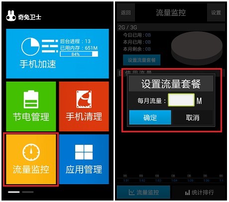 每個月的流量都超標?試試奇兔衛士的“流量監控”功能吧!每月在奇兔衛士裡設置好當月的手機套餐流量,即可實時監控到這個月手機流量的使用情況,如果超出限額,奇兔衛士會即時進行提醒,幫助你全面監控手機流量使用情況!