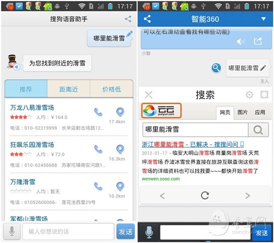 接下來就是關系到生活的“哪裡能滑雪”,《搜狗語音助手 Beta版》給出的是獲得較高評價的滑雪場及距離、電話和具體地址等,而《智能360-語音助手》則顯示的是一個叫雲雲搜索的搜索鏈接……
