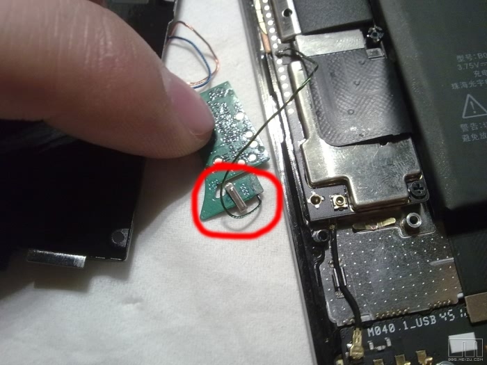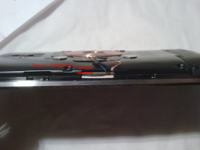 建議把線圈固定在中間偏下的位置(偏上容易造成改造後MX2無法完全貼合在石頭上,我這個裝的位置就有些偏上了,懶得改了),線圈通過漆包線延長,由鐵殼SIM卡處引入主機內部(這個地方縫隙較大,不會卡到線)特別注意那四個定位用的金屬片,一定要嚴格按照原裝的位置進行擺放,切記,切記。