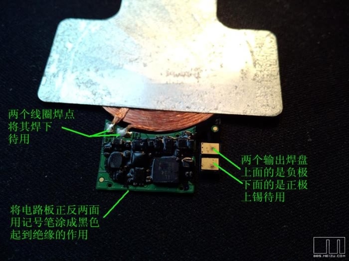 綠圈裡已經上錫的觸點就是USB口+5V的檢測點,用漆包線直接連接到線圈電路板的輸出正極。負極就是整個機器所有的金屬屏蔽殼,這裡我拆了一個廢U盤的USB接口觸點,焊在線圈電路板的輸出負極上,彎道線圈電路板的背面,這樣可直接連到下面的屏蔽殼,完成負極的連接,如下圖紅圈。
