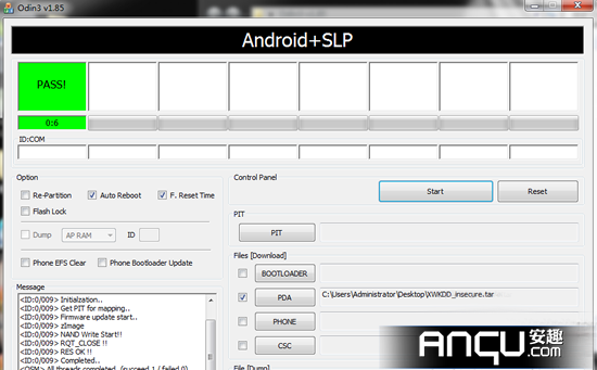 5.點擊“PDA”,選擇剛才下載的XWKDD_insecure文檔的位置,這時候確保只有3個位置是打開勾,如下所示。然後就可以點擊Start,等程序把這個內核包刷入手機後,手機會自動重啟;