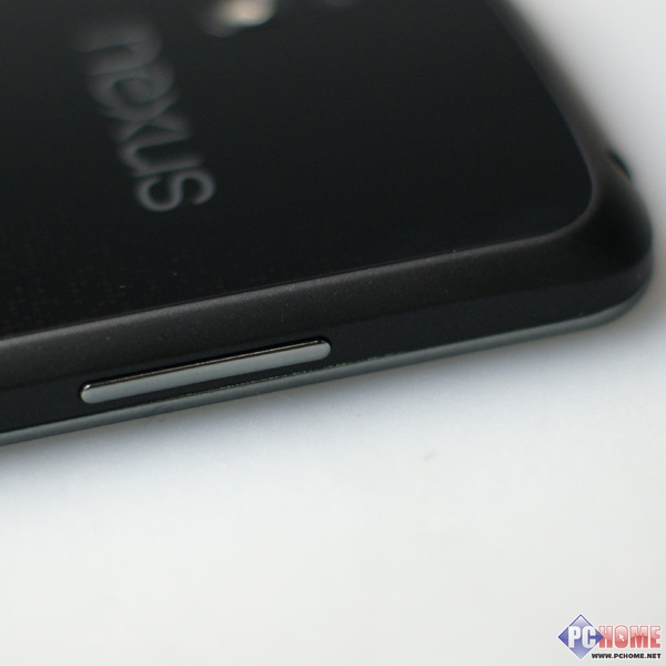 另外要說明一點,NEXUS 4是第一款一體式機身設計的Nexus手機,也就是說其後蓋是無法打開的。那麼SIM卡槽在哪裡?前面沒說,也在機身左側正中間。和iPhone一樣,需要一根細小的尖銳物插入旁邊的小洞洞,將卡槽頂出,不是很方便。