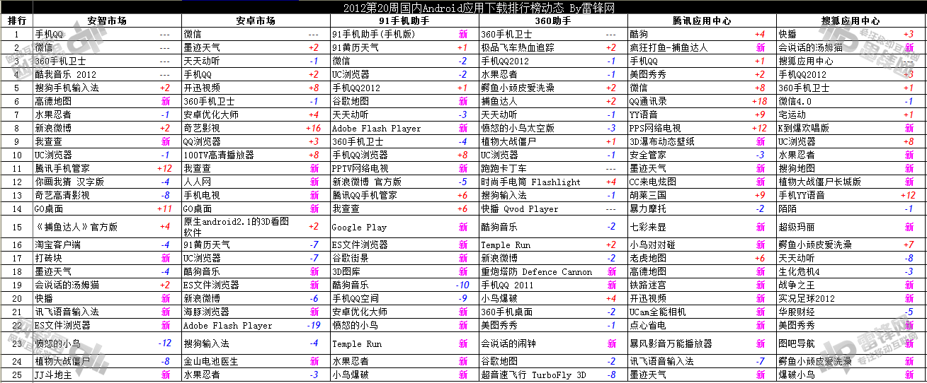 2012年第20周國內Android應用下載應用榜共包含安卓市場在內的十二家第三方應用商店數據,榜單總結如下:應用匯和木螞蟻更新最多,360創新低;微信羽翼漸豐,超越QQ