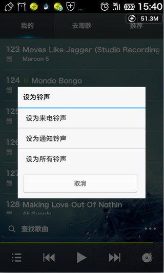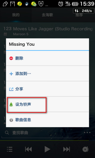 在手機的播放列表裡面,長按選擇一首歌曲,即可彈出一個選項框