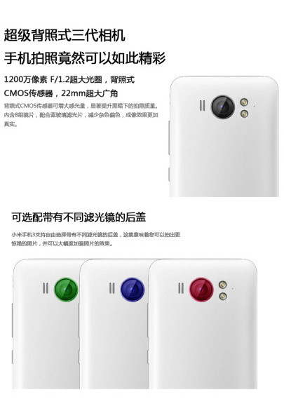 該機還內置有16GB RAM和150GB光速閃存,並且提供有1200萬像素攝像頭和2500mAh容量電池(可選配5000mAh),同時運行的是MIUI 5.0系統
