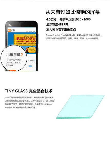 配備4.5寸1080p觸摸屏(ppi 480),屏幕使用了全貼合技術,其機身厚度只有5.1mm,並且搭載的是22nm的八核處理器。