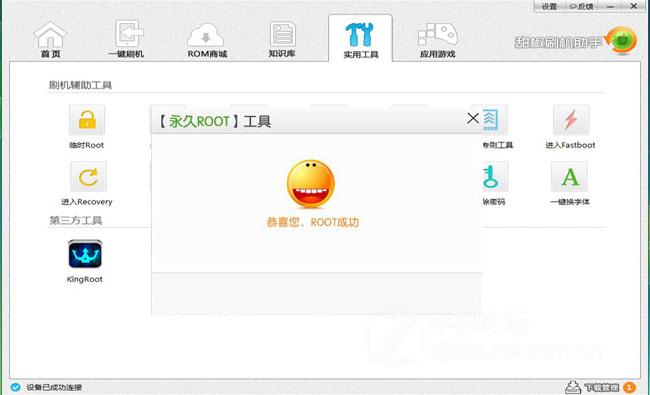 二、 解鎖(就是所謂的取ROOT權限)。我的手機未root,不過先做好備份吧。黃色按鍵一鍵“備份”,備份完後就點擊“實用工具”窗口,選擇一鍵root工具,臨時Root或者永久Root 工具(選擇任何一個對刷機都沒有問題),進行一鍵解鎖,幾分鐘左右,顯示ROOT成功界面(這裡甜椒最成熟的技術了,為小白們解決了大難題)。如圖:
