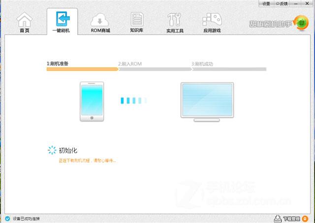 下載完了rom,直接按下開始刷機,系統會自動跳到一鍵刷機功能,或者直接把你下載好的帶有zip格式的rom包拖到窗口中,然後刷機,沒有一根煙的時間就會自動完成刷機。