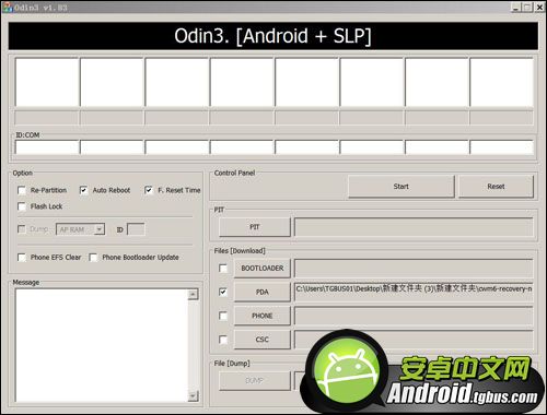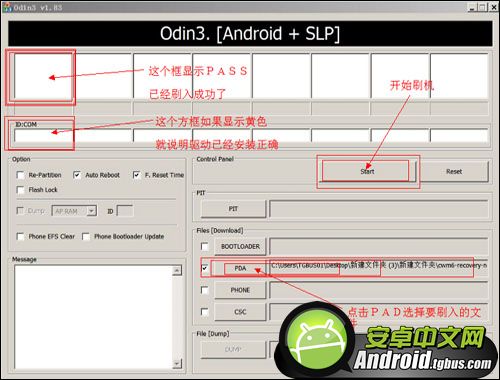 4、這時我們點擊PDA這個選項,然後我們先選擇刷入cwm6-recovery-note2.tar.md5這個文件,選中之後,我們點擊Start,然後在刷機工具最上方的第一個方框顯示PASS,說明已經刷入recovery成功。