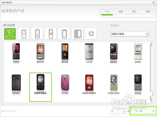接著需要選擇產品型號,然後進行下一步。他會根據機型提示你如何操作,首先關掉你的手機——重新安裝電池——先持續按住C鍵,然後才可以插入數據線。如圖所示。