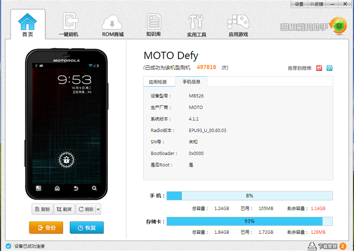 1.下載刷機工具安裝,如果那個40多M的安裝版不能正常安裝,可以先下載.net framework4安裝以後,再下載綠色版運行就可以。2.運行刷機工具,會自動識別你的機器並進入主頁面,如果你沒安裝驅動,還能自動安裝驅動。