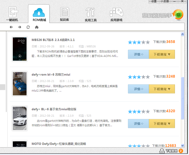 3.點擊“rom商城”按鈕,會顯示可以刷的ROM列表,點列表可以看到詳細信息。