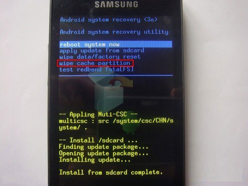 此時已經完成了一次wipe,屏幕會回到recovery模式主界面,接下來進行第二次wipe。用音量鍵選擇到wipe cache partition(清除緩存),按home鍵確認。
