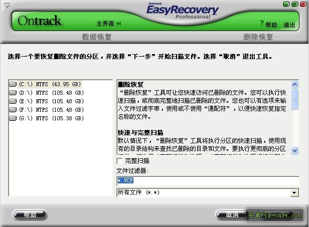 91的備份方式就是把手機裡的聯系人導出成*.VCF的格式,每個VCF文件都是以號碼簿的聯系人名稱命名,例如張三.VCF,用OUTLOOK就可以打開。考慮91助手不會以覆蓋刪除的形式刪除這些文件的,肯定是和我們平時shift+del一樣的方式,所以判斷用平常的恢復軟件就可以恢復出來,這少不了大名鼎鼎的EasyRecovery。(順便鄙視下一些國產軟件,功能不咋樣,甚至是抄襲別人的,還堂而皇之的收費?!) 下載並安裝後,打開軟件,選擇[刪除恢復],然後按照提示恢復就可以了,在【篩選】裡打上 *.VCF 就可以比較有針對性的恢復出來咱們需要的東西。