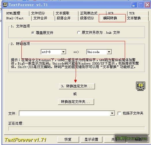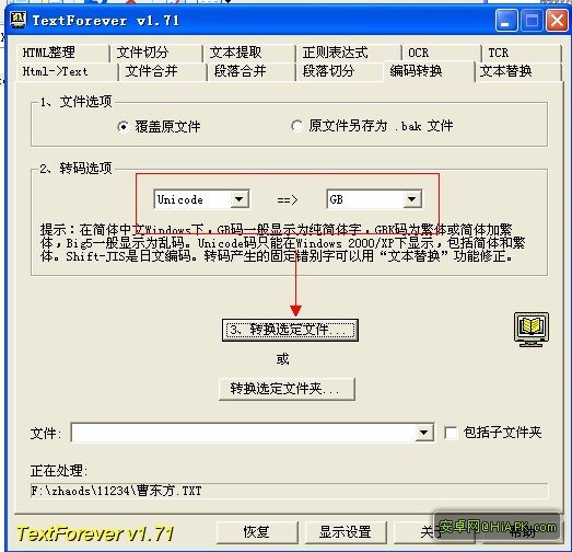 打開TextForever並按照紅框所選選擇,先把UTF-8轉換成UNicode.選擇咱們剛才用妖眼轉出來的TXT.