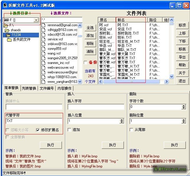 最後再次打開妖眼工具,注意[代替字符]裡咱們寫上VCF,就是最終需要的聯系人文件了!